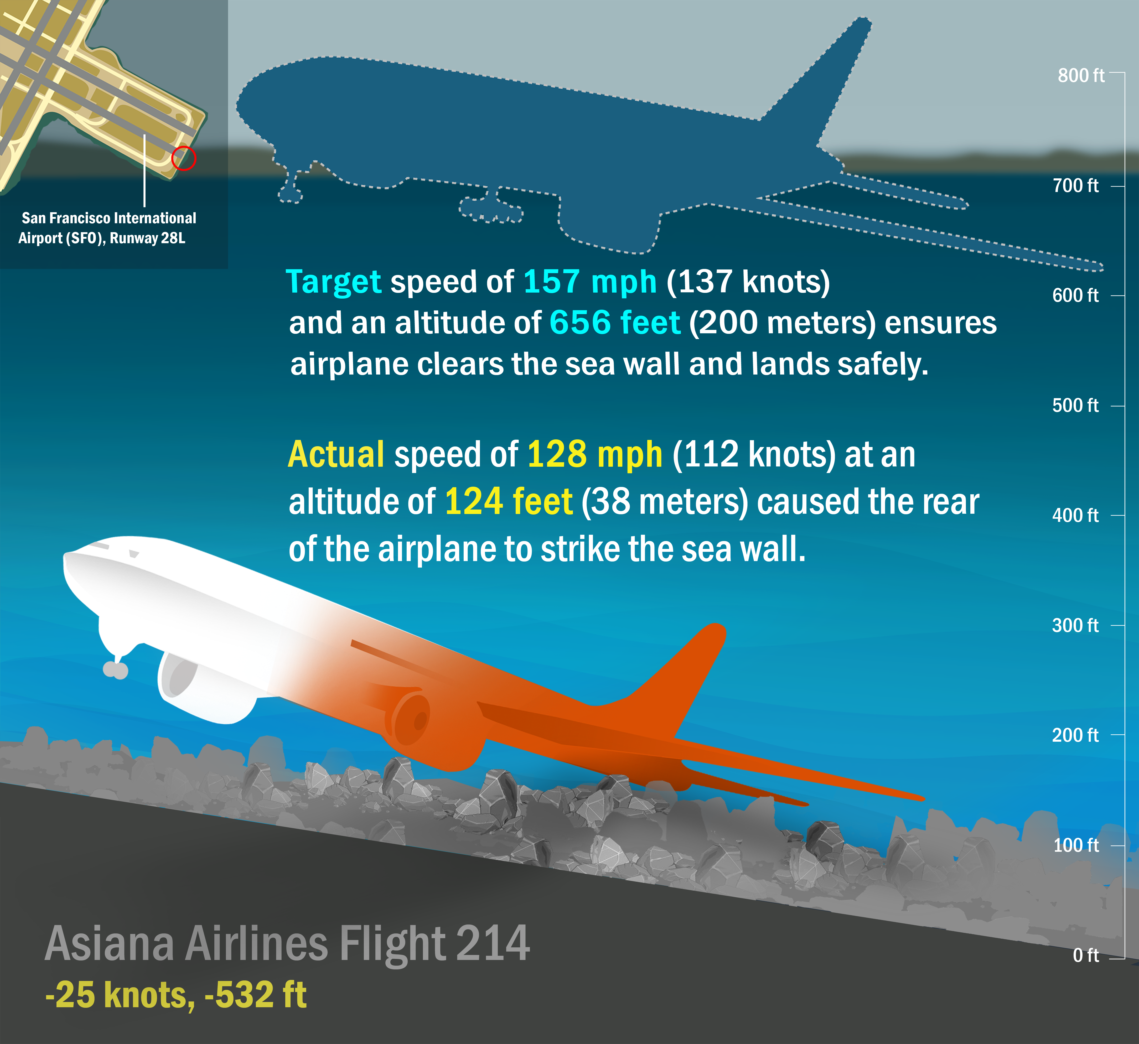 In this illustration, we effectively showed the difference between Asiana Flight #214’s target speed and altitude and its actual speed and altitude in the moments before impact. The location of the crash is depicted in the upper left-hand corner of the graphic.