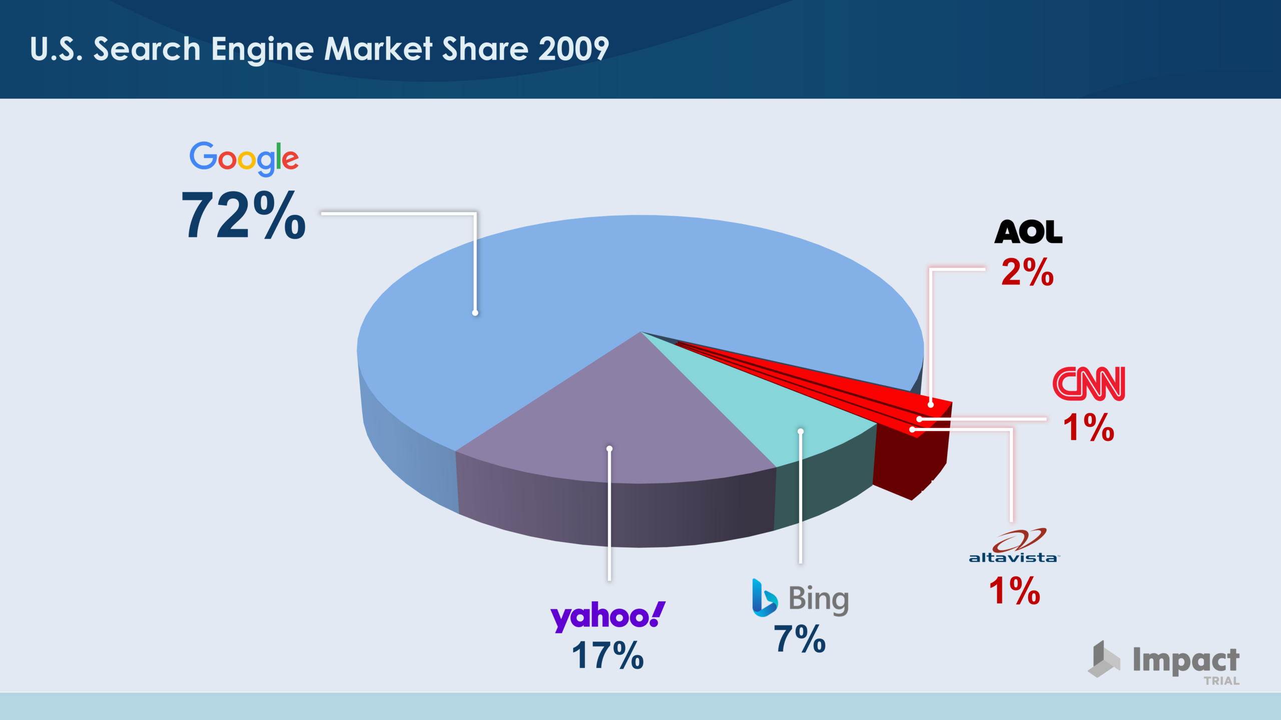 This example was designed to highlight Google’s competitors in the search engine market share space. By creating a three-dimensional pie chart and pulling out the 4% market share attributed to CNN, AltaVista, and AOL beyond the circle’s perimeter (without altering the actual size of that slice), we purposely emphasized the importance of that 4% percentage. This approach helped showcase the considerable impact of these smaller players in the market, allowing people to conclude that Google’s competition was not, in fact, sparse.